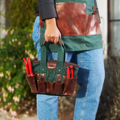 Mit dieser eleganten, wasserabweisenden Gartentasche behalten Sie Ihre Ausrüstung stets griffbereit. Sie ist aus grünem Canvas gefertigt, mit Taschen aus gewachstem Büffelleder und einem Boden aus Rindsleder. Elastische Innenbänder sichern Ihre Gartenschere und Ihr Zubehör. Die Tasche ist der perfekte, robuste Begleiter für Hobbygärtner in der Stadt und Profis.