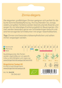 Wunderschöne und reich blühende sowie langlebige Schnittblume die von Schmetterlingen geliebt wird. Diese Zinnie hat große einfache Blüten in einer Vielzahl von Rot- sowie Orange- und Violett- sowie Gelbtönen. Sollte nicht zu früh gesät werden. Licht sowie Wärme werden zum Keimen und Wachsen benötigt. Ideal für Schnittblumen-Anbauer.